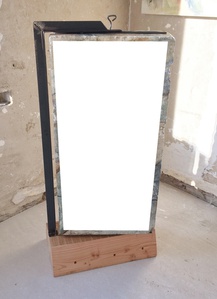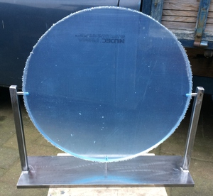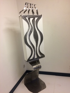 2015Een kunstenares werkt soms voor het transparante effect op de voor en achterzijde van plexiglas. Om het plexiglas dan vrij te kunnen laten staan zodat er ook licht van achteren door het werk heen kan vallen doet ze een beroep op mij om bijpassende standaards te maken. Deze metalen standaard heb ik in tweevoud gemaakt om twee dikke plexiglazen een stabiele rechtopstand te geven.